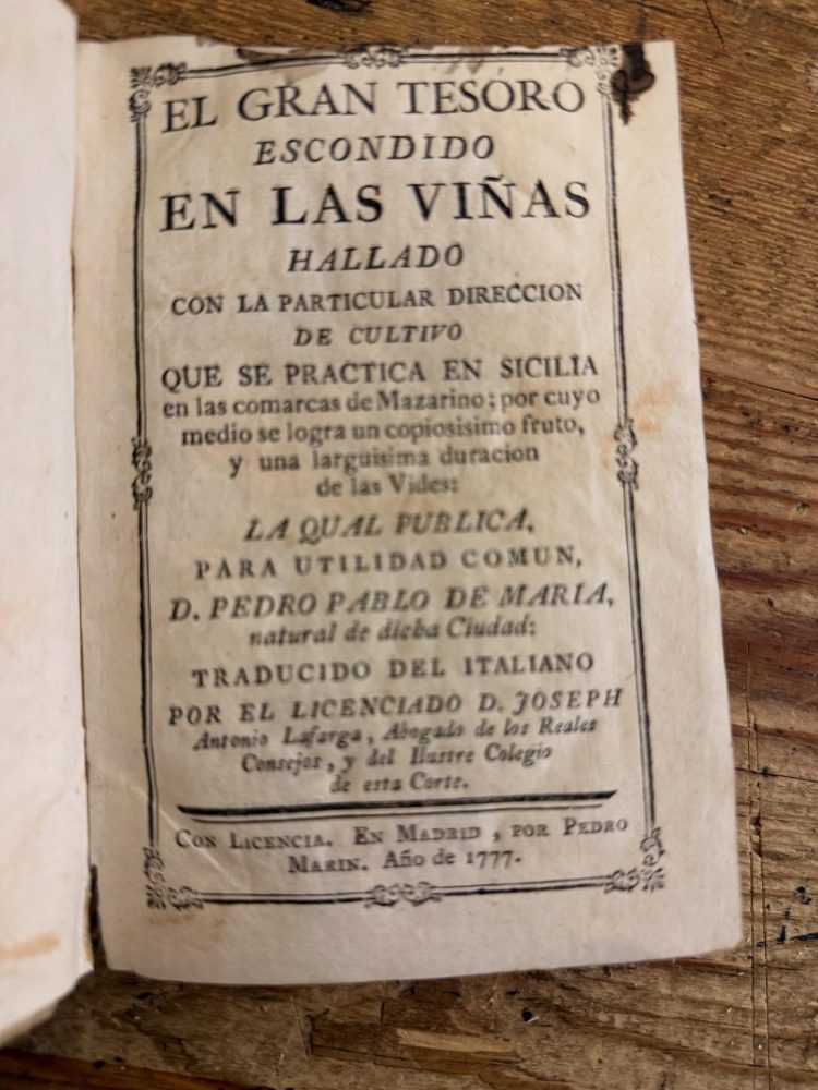 Vellum bound Spanish book on wine from 1777, the year that saw first battles of the War of American Independence, Captain Cook land on Christmas Island, and School for Scandal hit the London stage.om 1777
